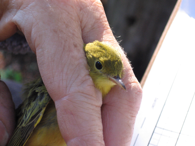 - The same orange-crowned warbler, held by Katy--here you can see the