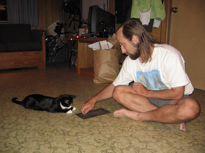 Oreo, fascinated by Dave's fingers scraping along a vent in my floor